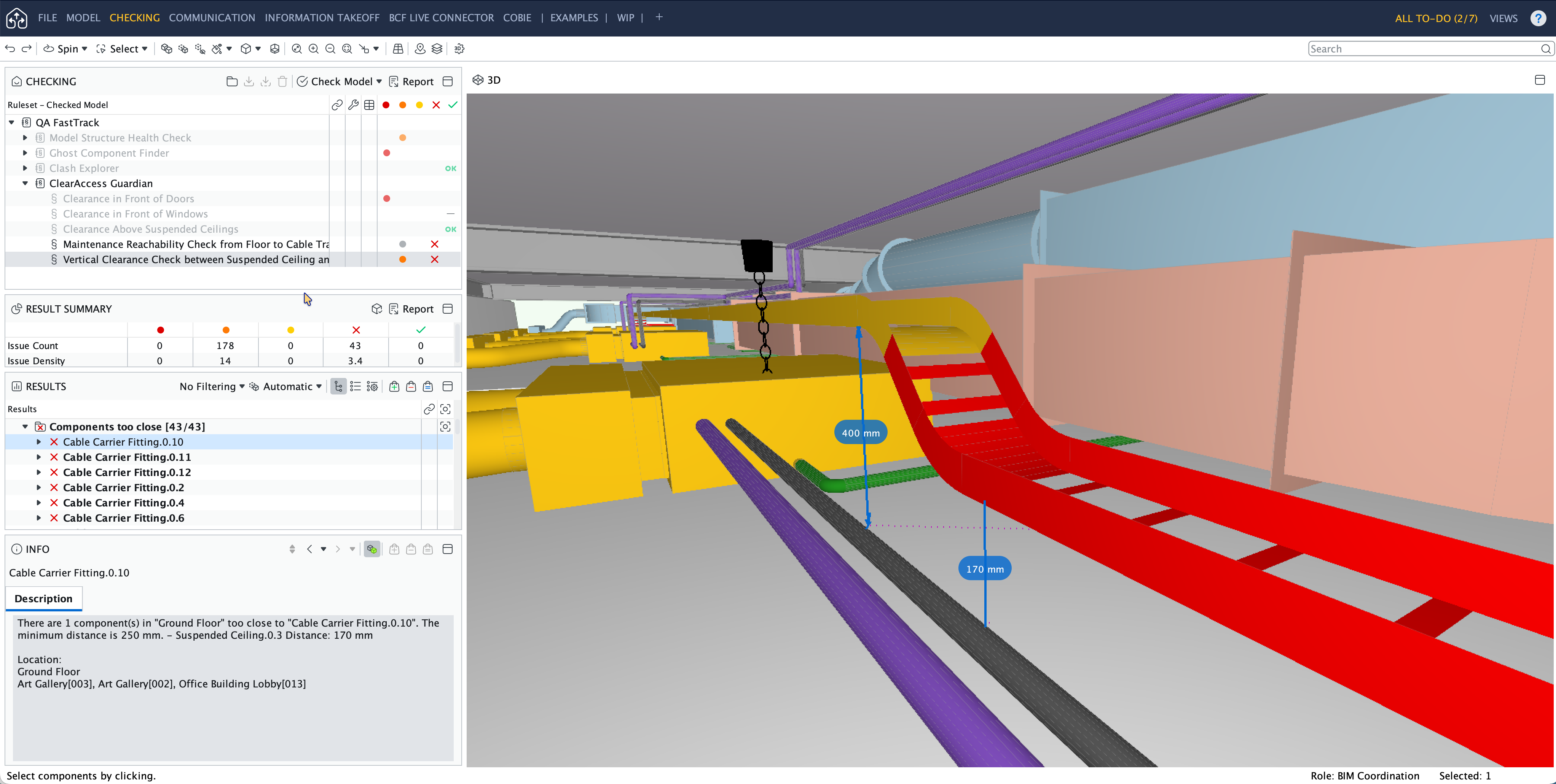Da mesma forma, as empresas de arquitetura, engenharia e construção (AEC) podem aplicar regras ao modelo para garantir a conformidade com as normas locais. Elas podem definir uma regra que mostre a distância máxima entre hidrantes, por exemplo, e então verificar se todo o projeto está em conformidade.